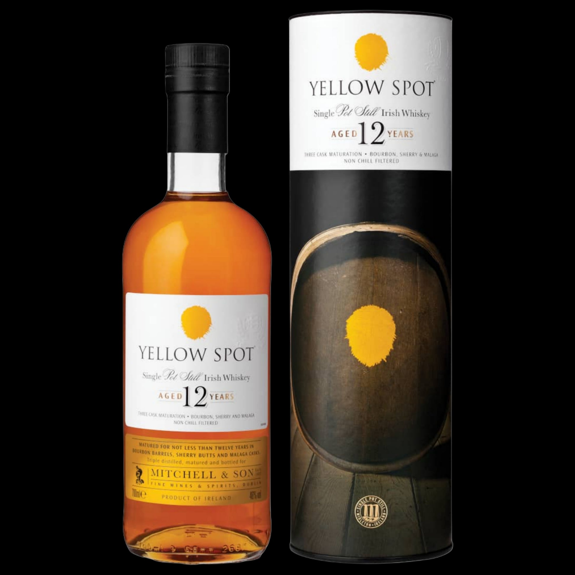 Yellow Spot 12 year old Single Pot Still Irish Whiskey is proudly produced exclusively for Mitchell & Son Wine Merchants, Dublin, where the brand originated. This whiskey contains single pot still compenents aged in ex-bourbon, ex-sherry, and ex-malaga wine casks. This maturation gives an added layer of complexity compared with its younger sibling Green Spot, but delves into the more complex aspects of the Single Pot Still Spirit.