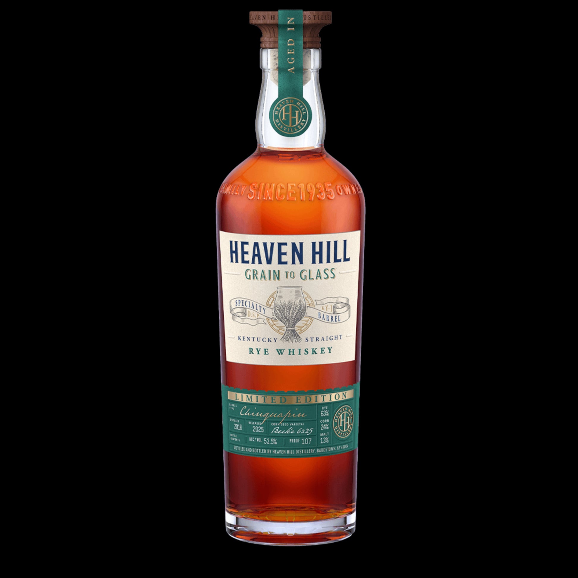 Bold, balanced, and beautifully complex — the 2025 Heaven Hill Grain to Glass® Specialty Barrel Series Kentucky Straight Rye Whiskey represents the pinnacle of Heaven Hill’s grain-to-glass craftsmanship. As part of the inaugural Specialty Barrel Series, this limited-edition rye is fully aged for six years in Chinquapin Oak barrels, a rare American white oak species prized for its rich vanillin content and layered sweetness. Distilled from a 63% Rye, 24% Corn, and 13% Malted Barley mashbill, this whiskey was barreled at 107 proof and bottled non-chill filtered, capturing the pure essence of grain and wood in perfect harmony. The Chinquapin Oak imparts a luxurious depth — aromas of dark chocolate, roasted coffee, and brown sugar lead into a palate of caramelized spice, citrus zest, and honeyed oak, finishing long with pepper, cocoa, and toffee warmth. Each bottle is presented in a custom 700ml design embossed with “Family Owned Since 1935,” featuring a distinctive jewel-toned label, gold-coin cork insert, and a transparency panel detailing the corn varietal, mashbill, and distillation year. This expression honors Heaven Hill’s continued dedication to transparency, sustainability, and the art of maturation. Tasting Notes: • Nose: Cocoa, roasted coffee, and dark fruit with hints of toasted oak • Palate: Bold rye spice balanced by butterscotch, honey, and caramelized orange peel • Finish: Long, warming finish with notes of chocolate, oak, and baking spice Details: • Type: Kentucky Straight Rye Whiskey • Series: Heaven Hill Grain to Glass® Specialty Barrel Series • Barrel Type: Chinquapin Oak • Aged: 6 Years • Proof: 107 (Non-Chill Filtered) • Mashbill: 63% Rye | 24% Corn | 13% Malted Barley • Distilled & Bottled by Heaven Hill Distillery, Bardstown, KY • Release Year: 2025